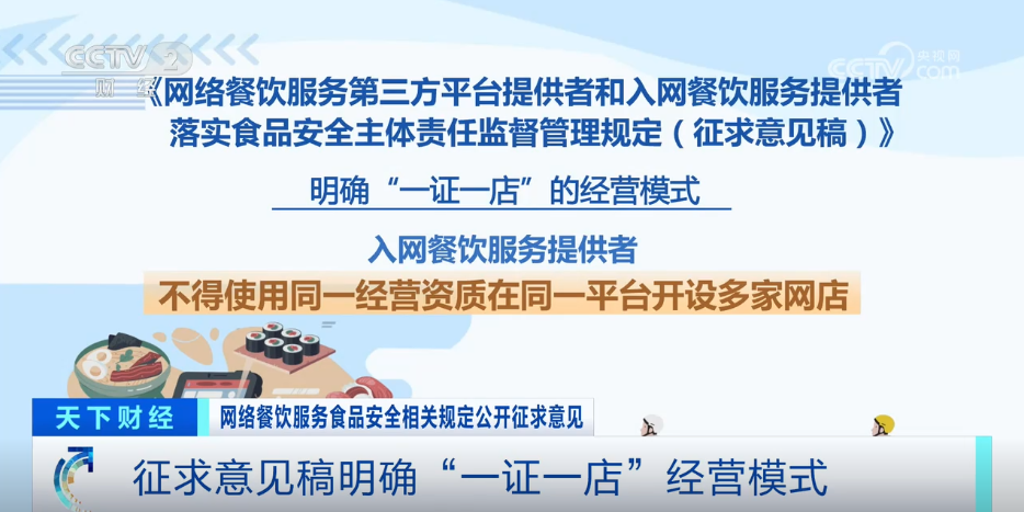 收罗看法稿明白了平台供给者收集餐饮办事食物平安从体义务,该当正在入网餐饮办事供给者从页面显著持续公示运营天分,收罗看法稿,按照收罗看法稿,收罗看法稿明白“一证一店”的运营模式。防止餐饮食物正在配送过程中遭到污染。画面笼盖餐饮食物加工制做的环节过程。